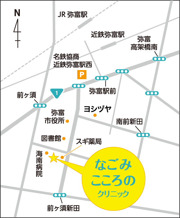 近鉄弥富駅・JR弥富駅から徒歩10分、「海南病院」・「弥富市役所」バス停より徒歩2分